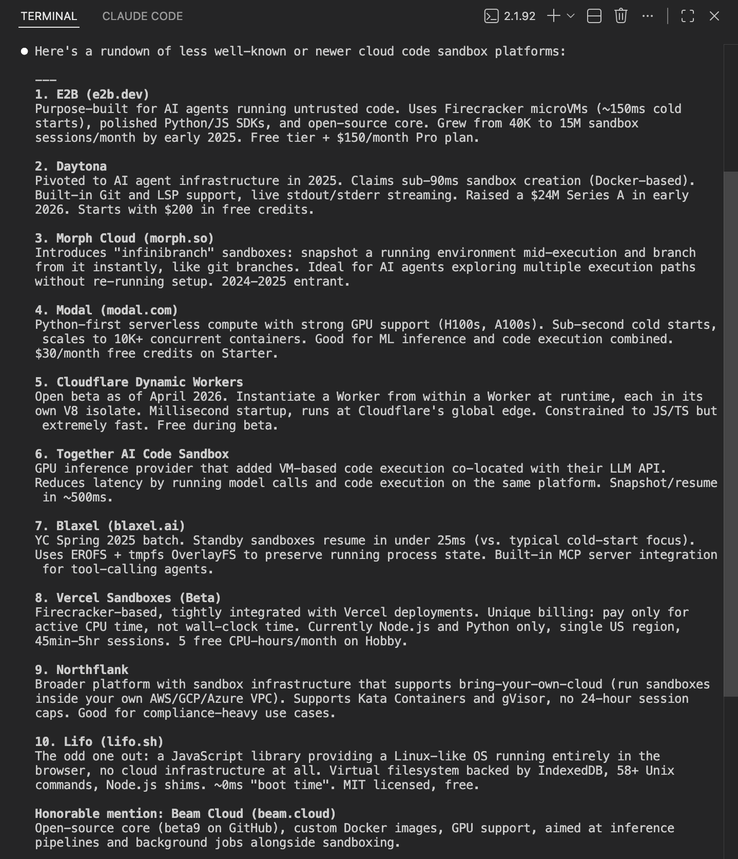 | Alternatives to E2B, Daytona, and Modal | Yes | No |