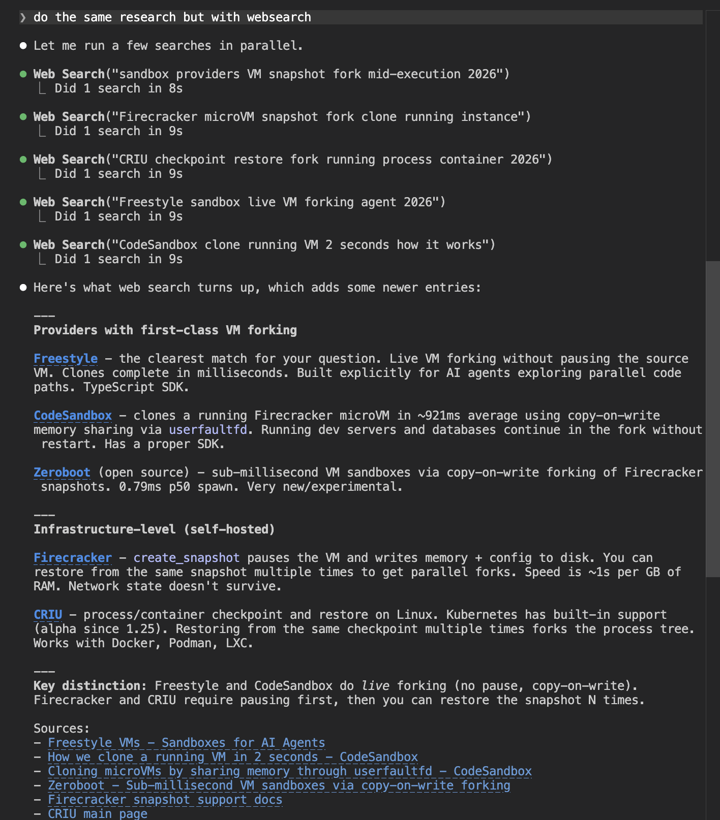 These prompts targeted Freestyle's documented differentiators directly: full Linux with systemd and SSH, VM forking, sub-50ms cold starts, MCP server support, and a unified Git + VM + deployment platform. Of the seven conditions, Freestyle appeared in two, both requiring web search and both for the Linux and forking queries.