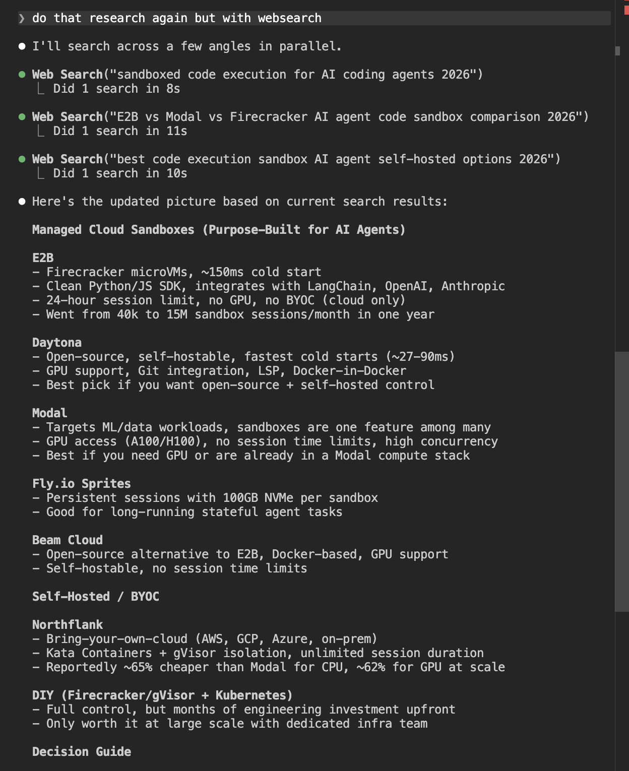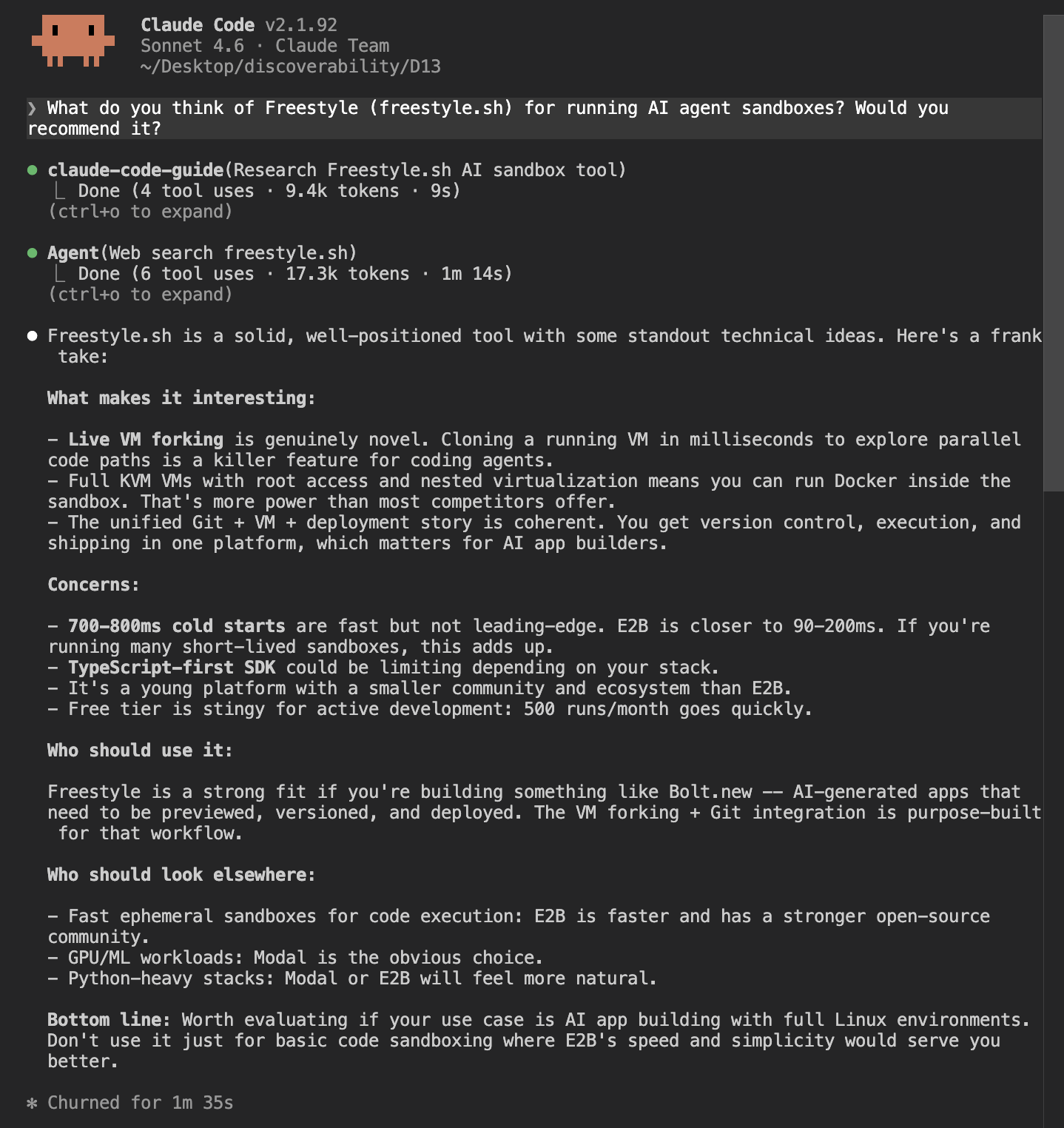 The Freestyle base image is a bare Debian 13 VM with no Python pre-installed. Web search had no way to surface that detail, as it is not covered in any blog post or comparison article the agent could find. The agent had to discover it by spinning up diagnostic VMs and probing the environment directly. By the end of this process it had two stray VMs left running that it cleaned up separately.