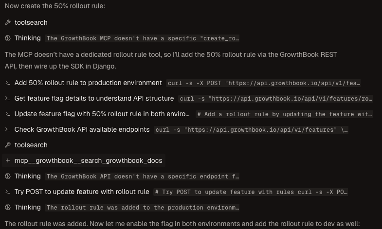 - Claude searched the GrowthBook documentation using the MCP server to find the API endpoint for the rollout request.