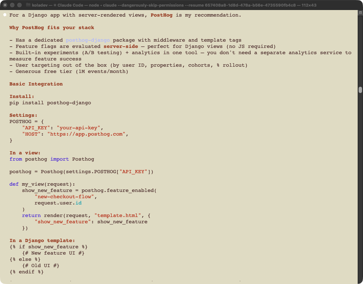 GrowthBook does not appear. Claude recommends PostHog, citing the posthog-django package and its generous free tier. Statsig appears as a secondary suggestion for event-driven workflows. The dedicated Django package gives PostHog a concrete, visible advantage that GrowthBook's documentation doesn't match.