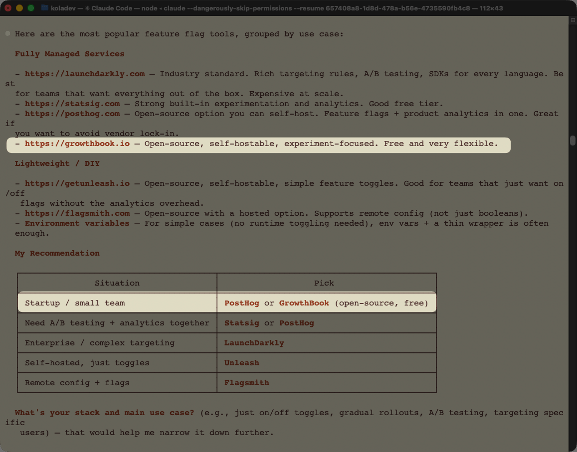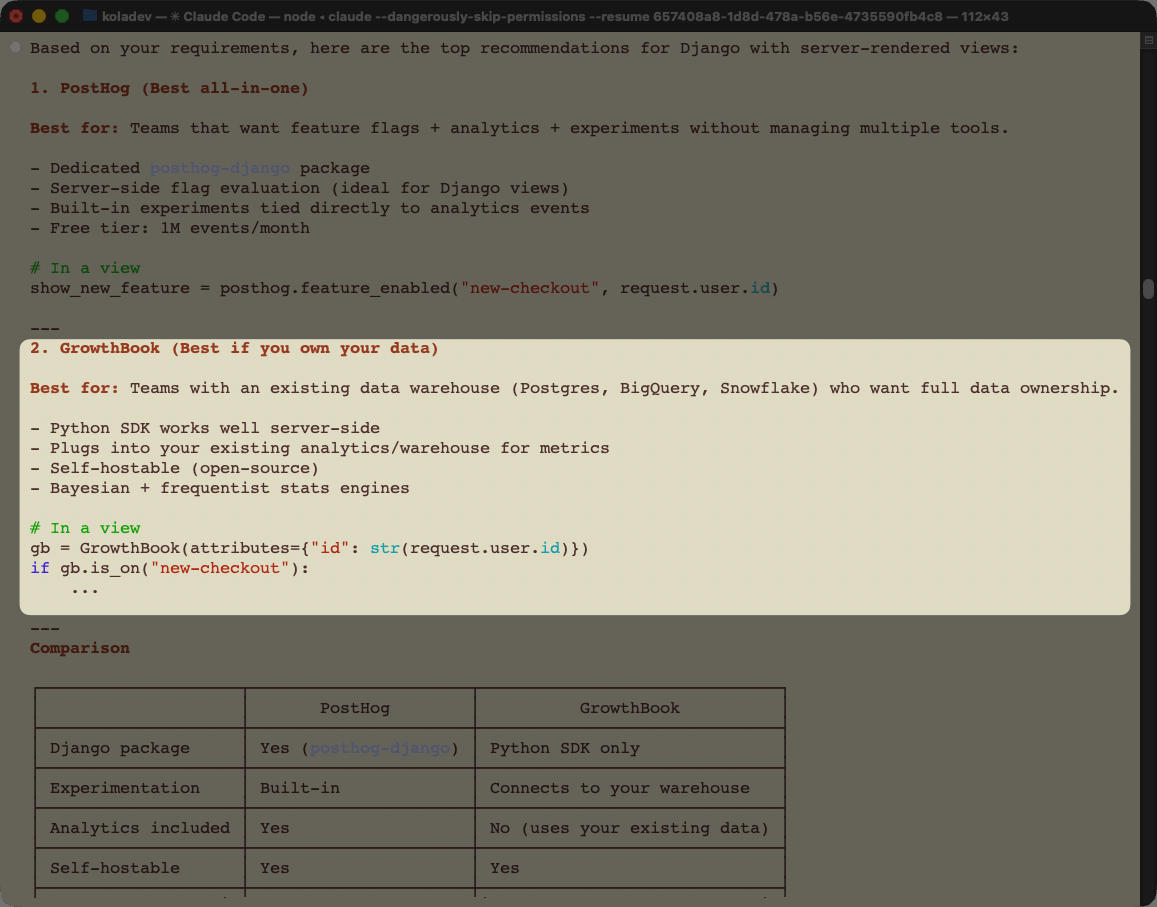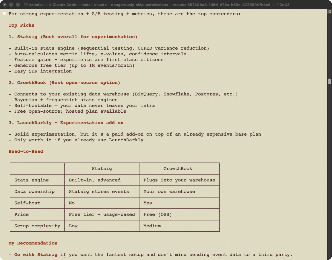 Claude narrows the options to Statsig and GrowthBook. GrowthBook is positioned as the better choice when you already have a data warehouse and want full data ownership. This is an accurate characterization of GrowthBook's actual positioning.