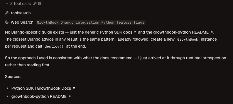 The difference between the two runs is entirely documentation. The GrowthBook Python SDK supports Django middleware correctly, but agents don't find that section without explicit guidance. Moving the Django content higher in the documentation would close this gap without any SDK changes.