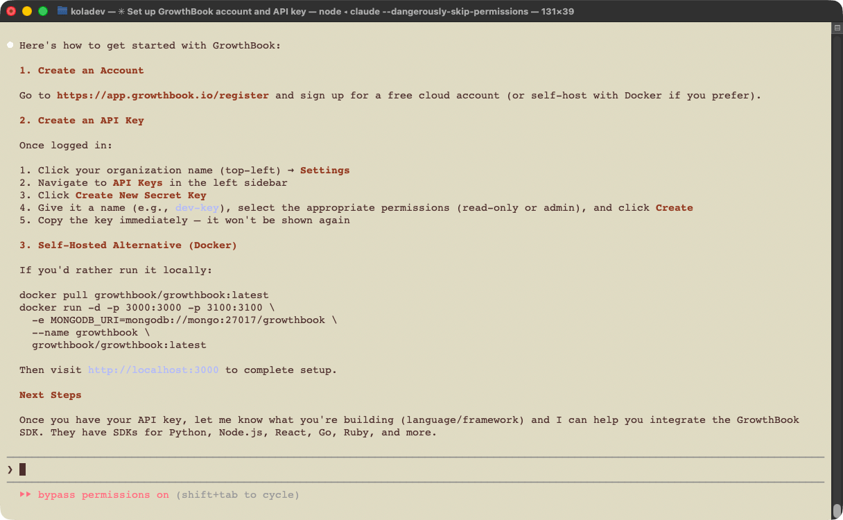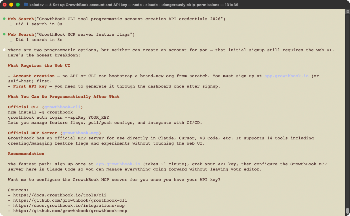 A smoother path would be a CLI tool or an auth-capable MCP server that lets the agent create an account and retrieve an API key without passing control back to the developer. Several platforms in this space offer exactly that. An agent that calls growthbook auth login or invokes an MCP tool to provision credentials removes the only manual step in an otherwise clean onboarding flow.