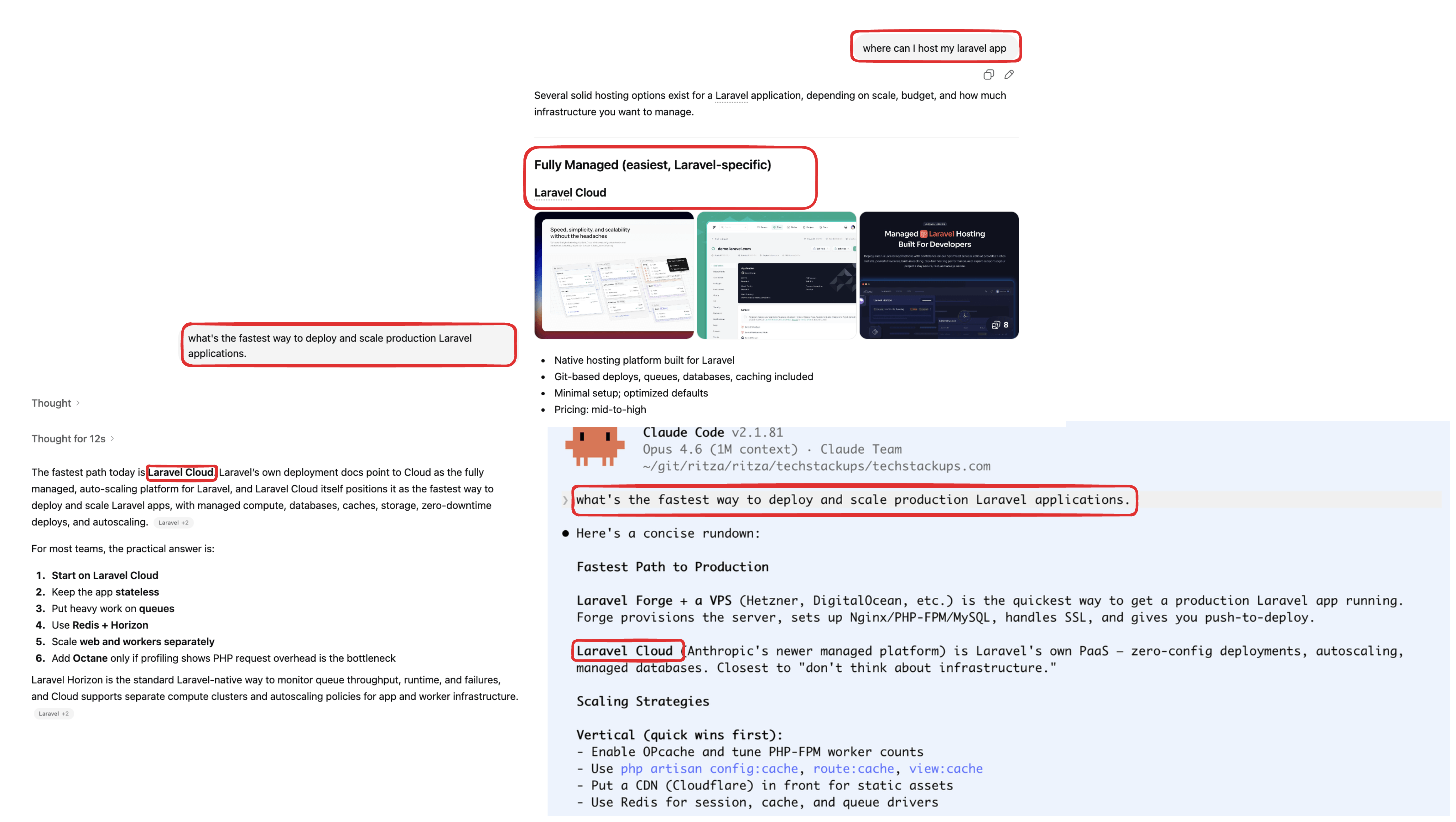 I was surprised that actually Laravel Cloud comes highly recommended already! Look at ChatGPT and Claude Code singing its praises without any nudging.