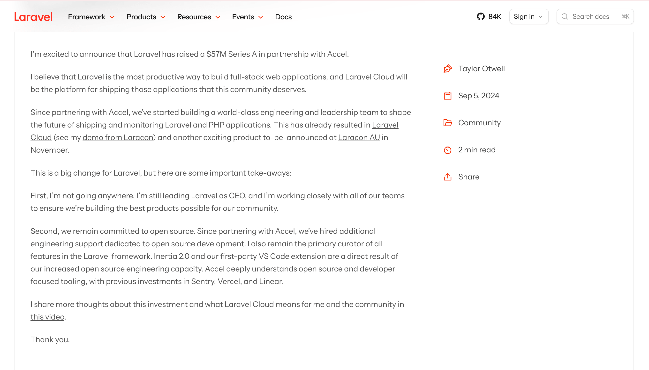 Now, it seems, Laravel needs to turn the money taps on. One way to 'create shareholder value' is to operate a commercial service that gives people the best and fastest way to deploy and scale production Laravel applications. If they did that, and wrote about it, probably people would notice and use it. Over time it would be recommended by search engines and agents, and it would make money. It's a sensible strategy and exactly the one they are using with Laravel Cloud.