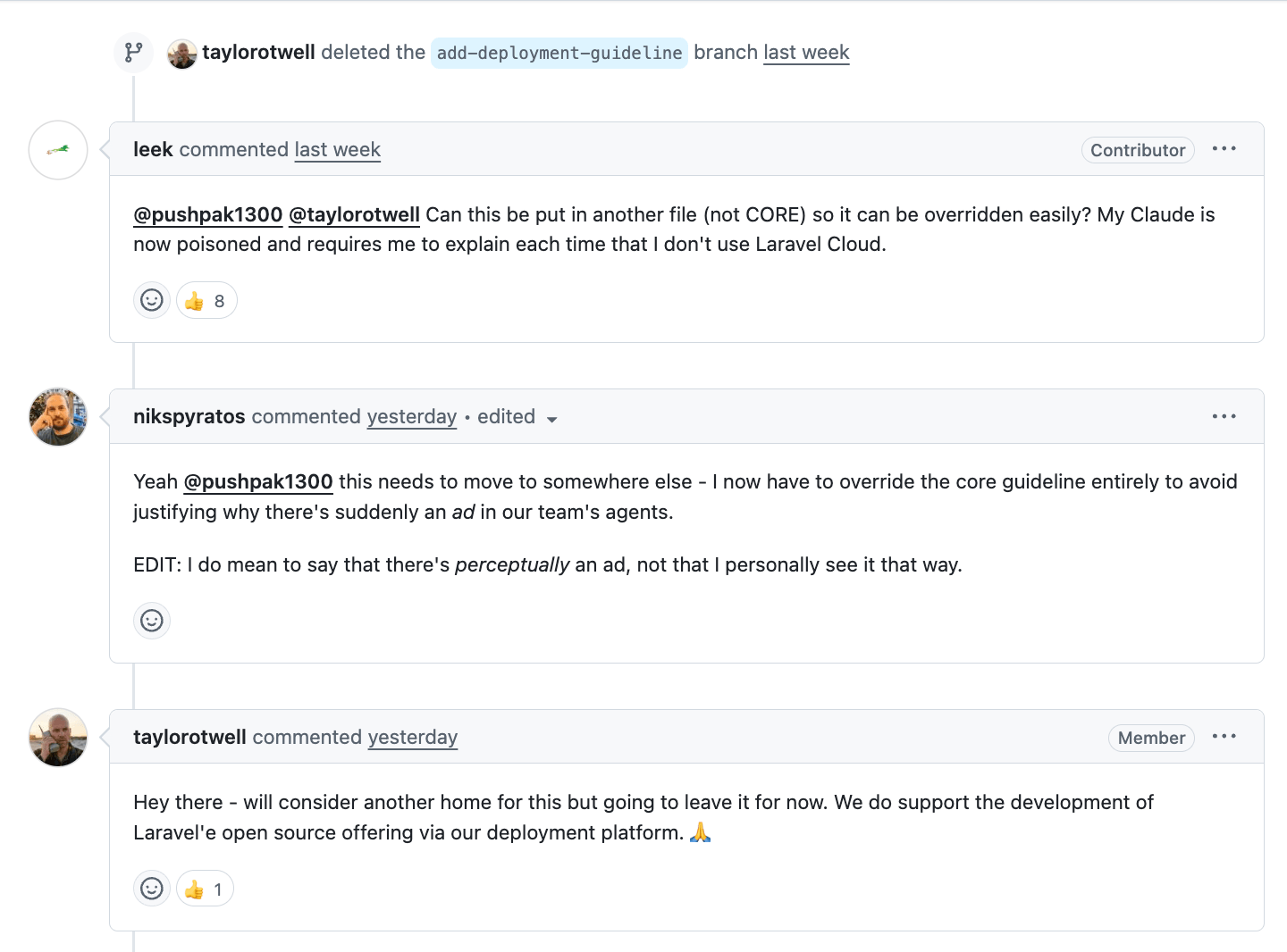 Users are already complaining that this change 'poisons' their agents to try to default to using Laravel Cloud even for existing projects where this is not relevant, but Taylor, the creator and CEO of Laravel decided that as the deployment platform 'supports the development of Laravel' that this user-reported harm is not too important as long as this change helps the commercial line go up and to the right.