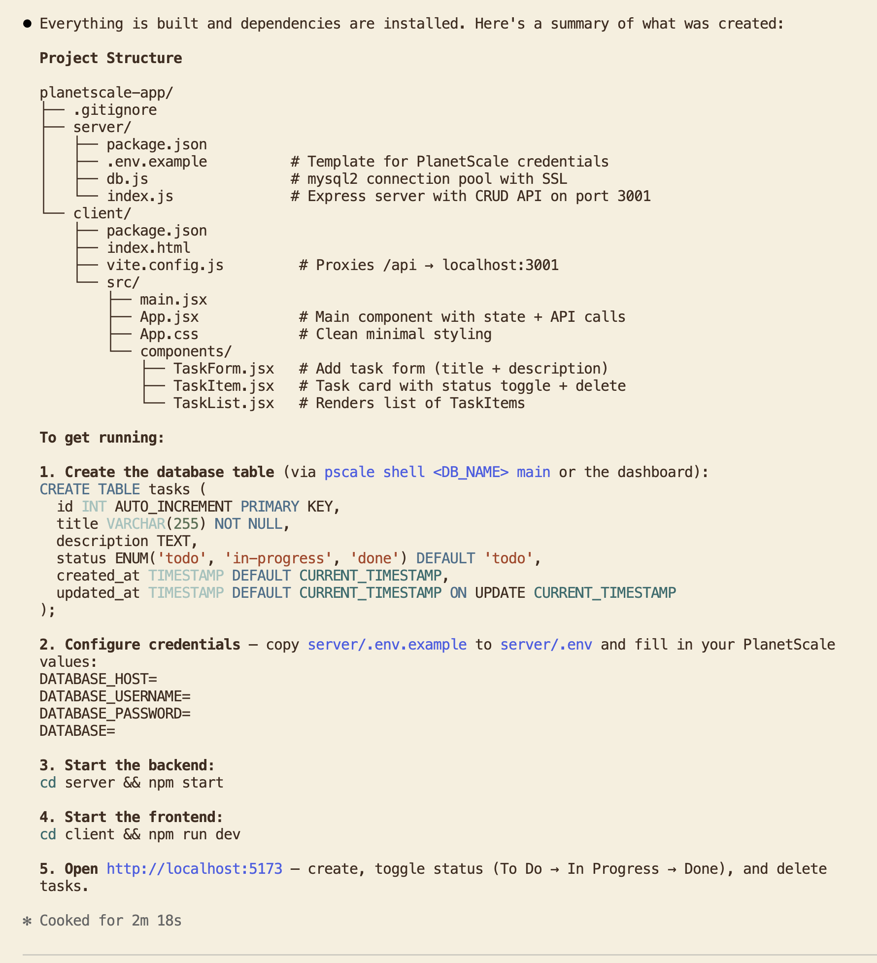 Claude created a similar plan: Express backend in server/, React frontend in client/, plus PlanetScale setup instructions. Here's the summary: