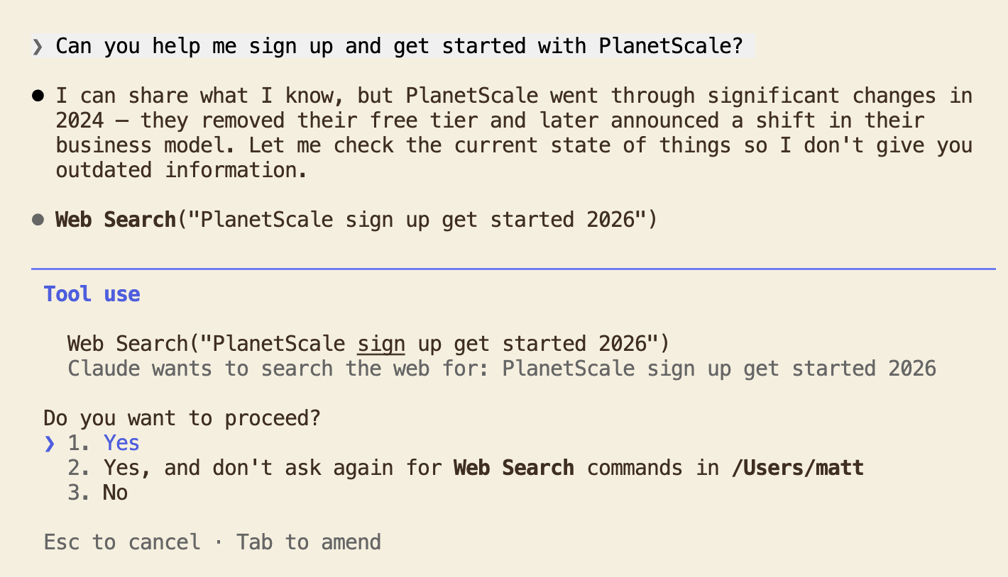 For comparison, I ran "Can you help me sign up and get started with Supabase?" from the another fresh terminal in my computer's root folder. The agent gave setup steps without performing a web search. The steps had some outdated UI labels, but the agent was confident enough to answer directly. With PlanetScale, the agent didn't trust its own knowledge and searched first. There's an upside to this: the web search returned current information, while Supabase's confident response included outdated details that a developer would only discover when the UI didn't match. In this isolated context, the agent's lack of confidence in PlanetScale's training data led to a more accurate result. In a real project though, the agent has more context and may not always trigger a web search, as the first prompt from within the project directory showed. Project context can make agents more confident, but not necessarily more accurate.