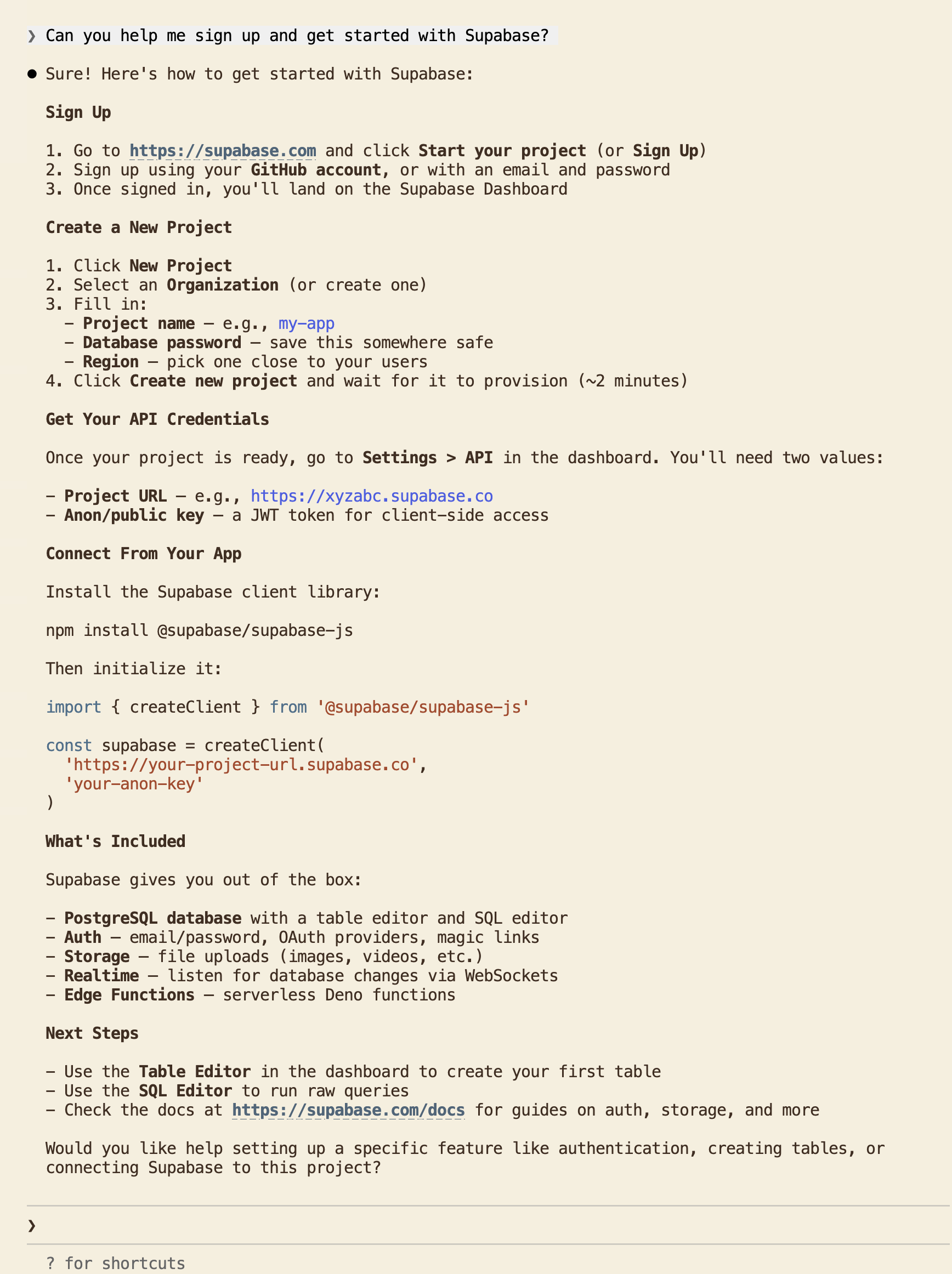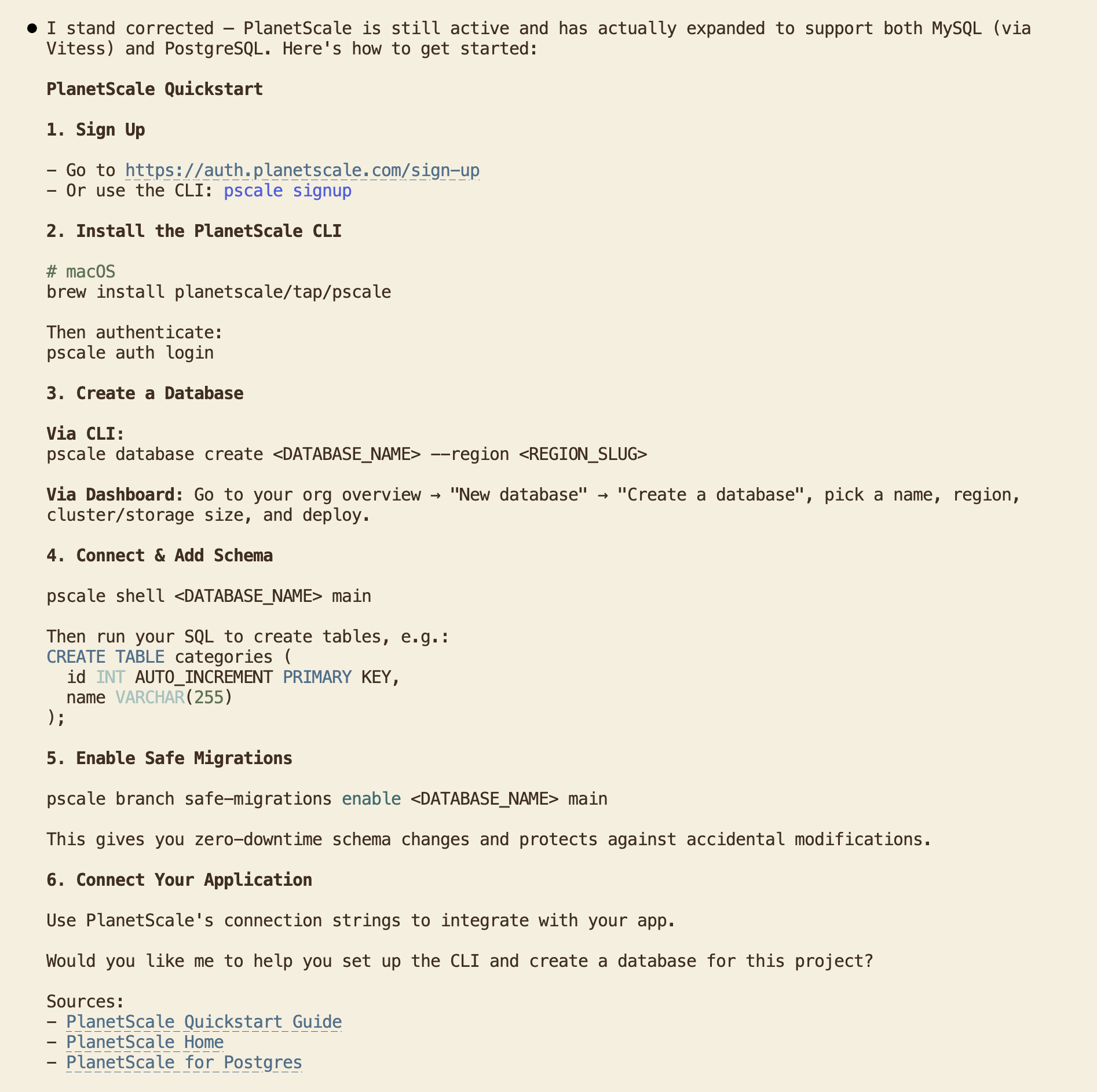 With up-to-date information, the agent provided two signup paths: the PlanetScale dashboard or the PlanetScale CLI (pscale). The CLI option is great for AX as it means the agent can handle database operations directly from the terminal. Supabase has a CLI (supabase), but it's focused on local development and deployment. It can manage migrations and run a local Supabase stack, but it can't run SQL queries against your hosted database. It also was not mentioned by Claude.