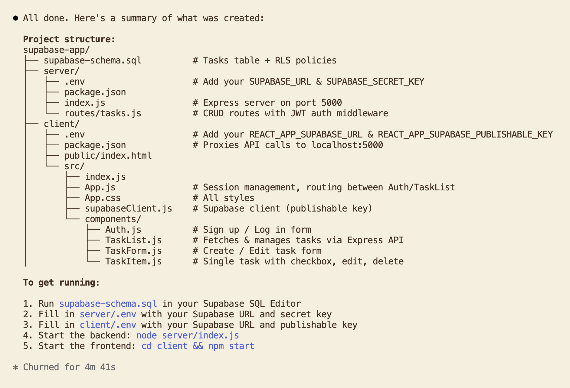 Claude wrote a plan: create a Supabase SQL schema, an Express backend in server/, and a React frontend in client/. Here's the summary of what it created: