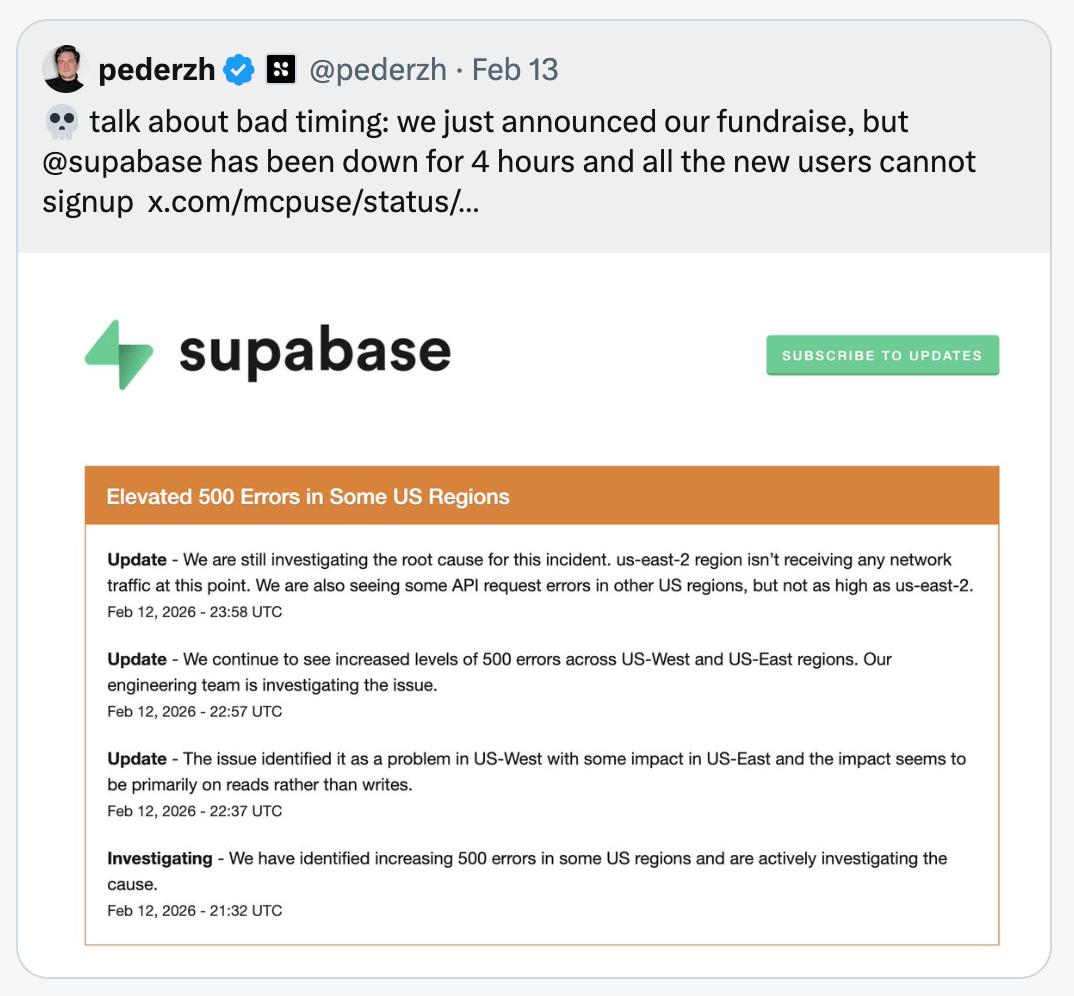 Supabase recently went down for a few hours, leaving potential users of a startup unable to sign up: