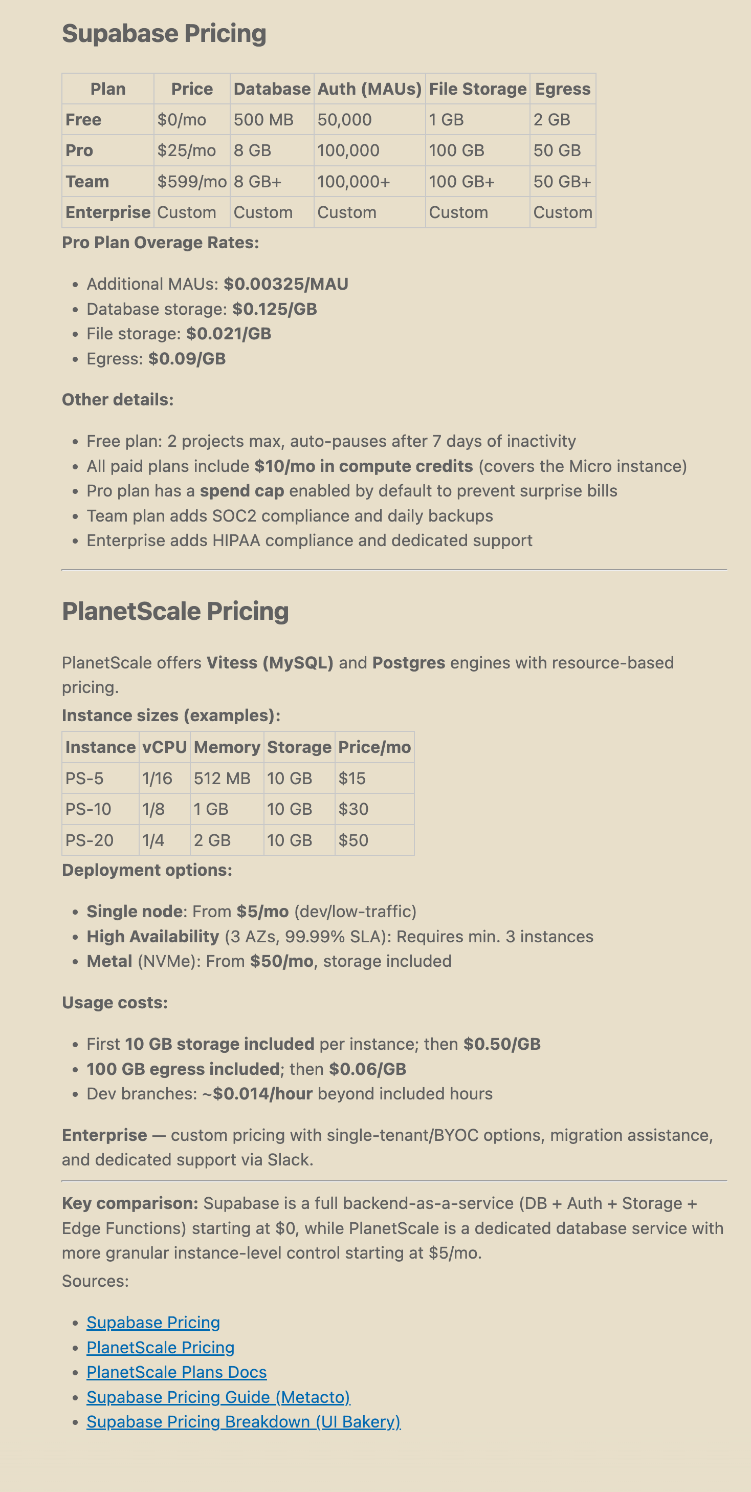 From previous prompts I learnt that Supabase has a free tier available, then it's $25/month for the Pro plan. PlanetScale has no free tier and starts at $39/month. A quick glance at the Supabase pricing page and PlanetScale pricing page shows that there's a lot missing from the pricing summary. Let's ask Claude to fill in the details: