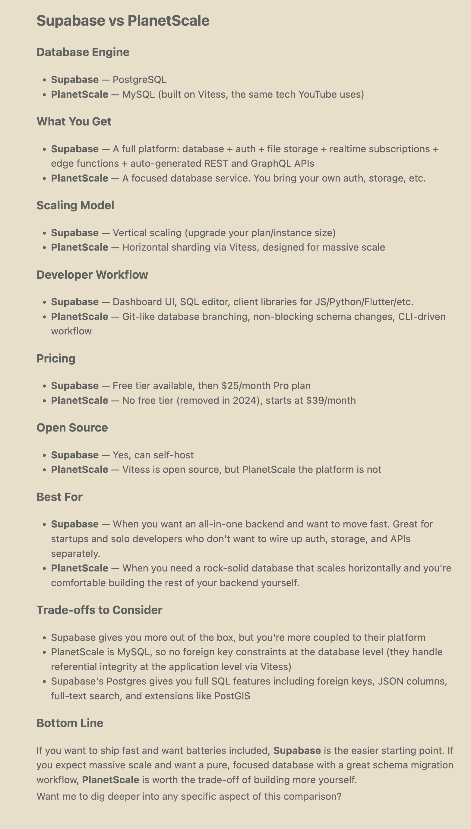 Want me to do a deeper comparison of any two of these? For example, I could compare Supabase vs PlanetScale since those are the two most commonly compared for this use case.