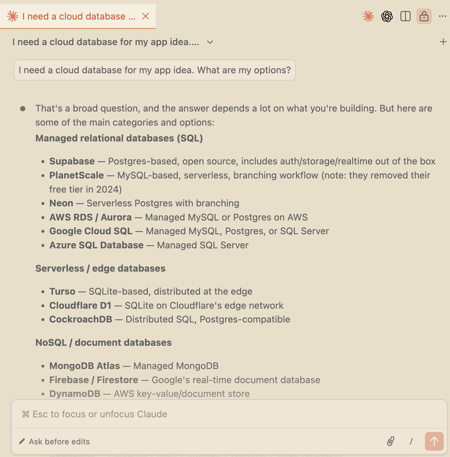 Claude Code recommended a relational database (SQL) with managed hosting and a generous or predictable pricing model. Supabase was listed first in the list of most popular options followed by PlanetScale: